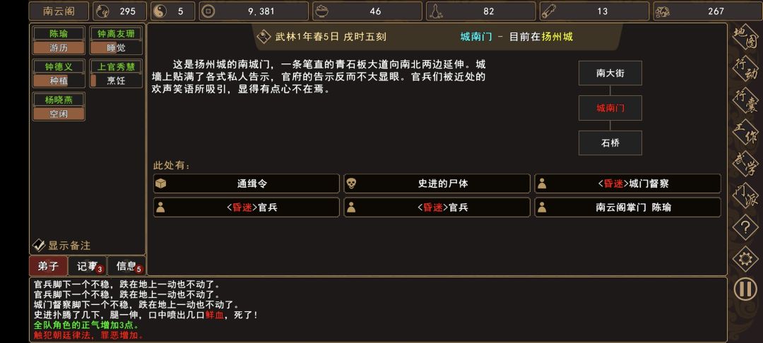 (1)前往 扬州城→城南门→[人物:巡捕首领 史进]对话 选择攻击,触发剧情分支(选择①/②无法完成任务,类似于重选项),选择:③“暴力抗捕……”(会被围殴)。