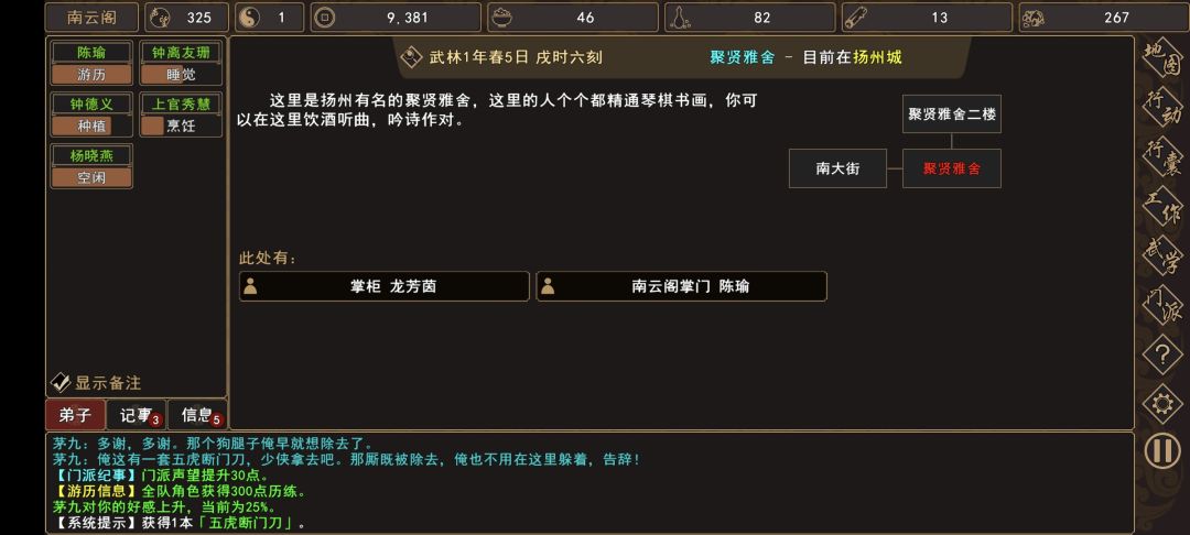前往 扬州城→①城南门/②聚贤雅舍,帮助①史进/②茅九。