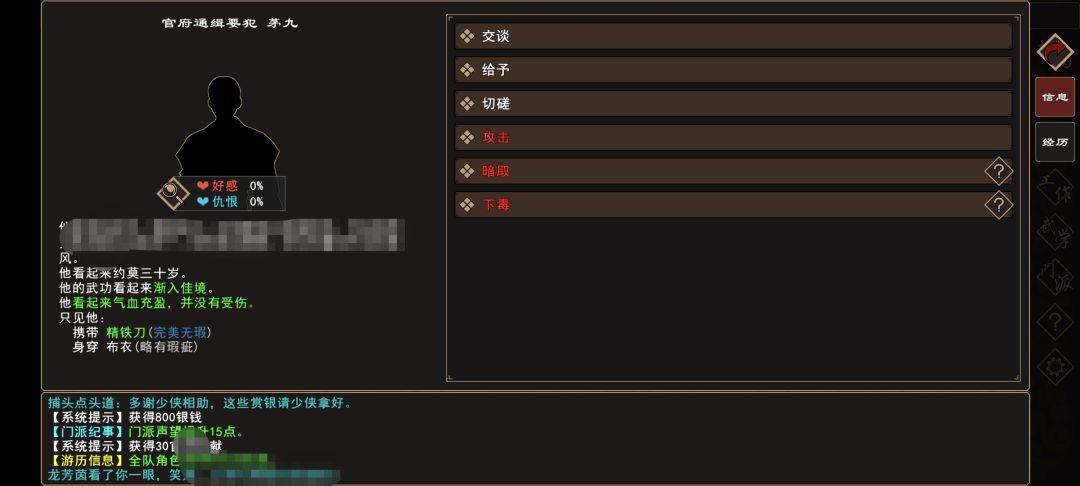 (3)[人物:官府通缉要犯 茅九]好感度提升至25%。