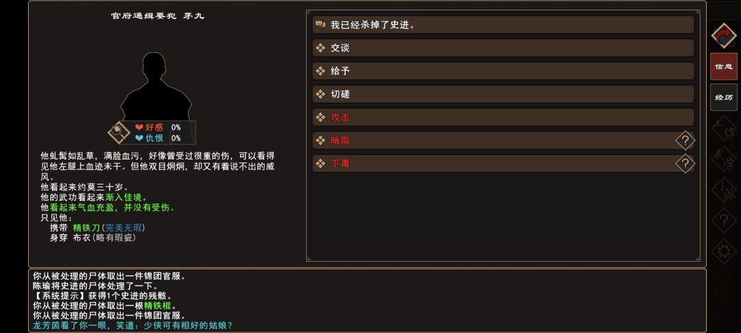 (2)战斗胜利后,[人物:官府通缉要犯 茅九]陷入昏迷,对话 选择攻击。
