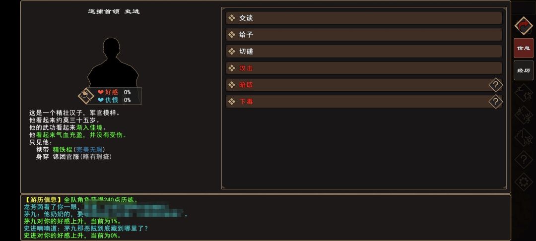 (3)[人物:巡捕首领 史进]好感度提升至25%。