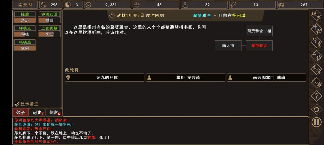 (1)前往 扬州城→聚贤雅舍→[人物:官府通缉要犯 茅九]对话 选择攻击,触发战斗。