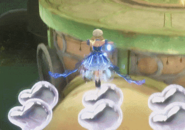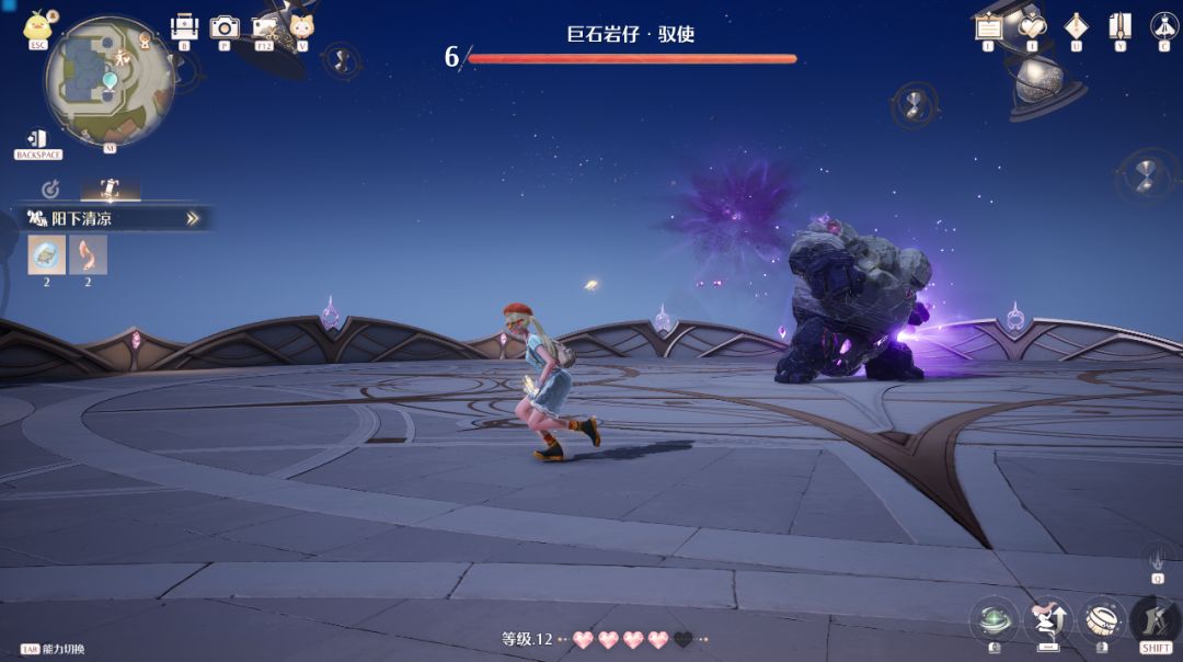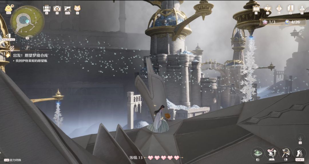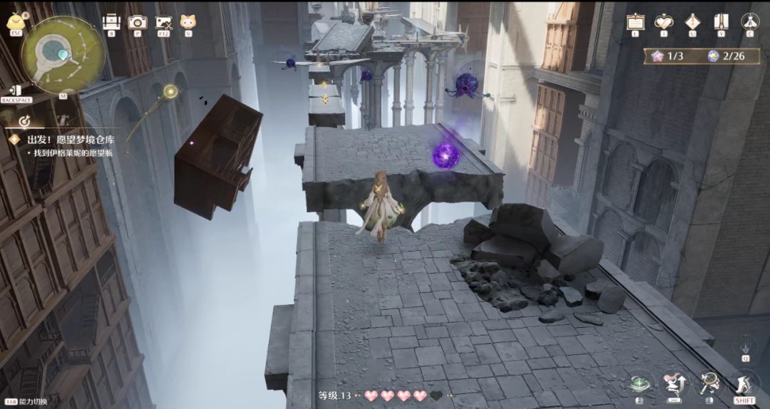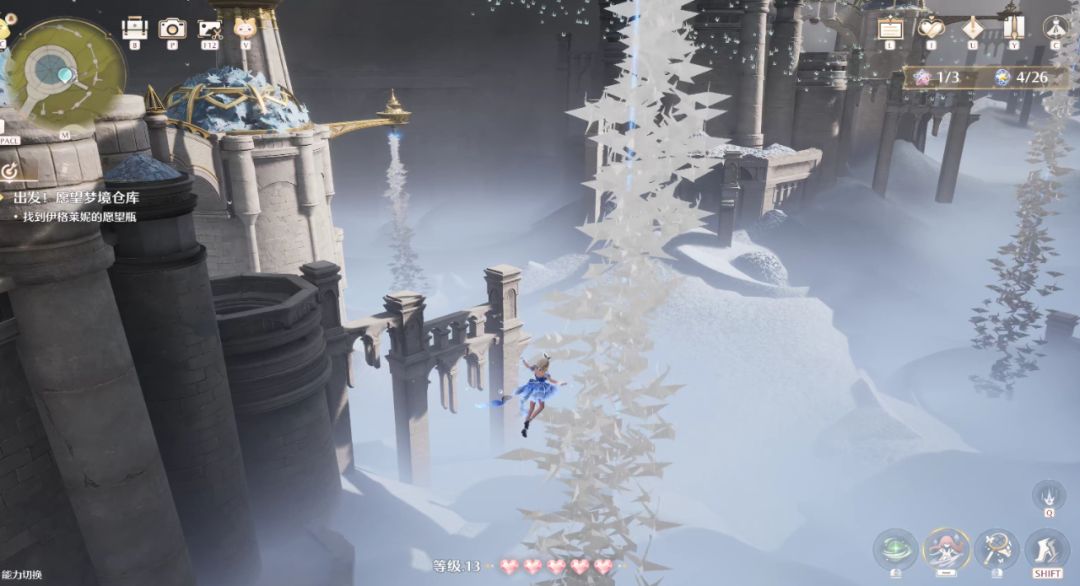 而另一个大型副本“愿望梦境”,整个地图由三个不同风格的场景嵌套而成,跃过满是巨大千纸鹤的图书馆后,就会来到之前游戏演示里多次出现的深渊。交互机制恰好设成了一个微微干扰前行的程度,于是整个体验是连续而不被打断的,可以带着愉悦和欣赏美景的心情在幻境里穿行。又经过几个跳跃机制的小场景后,整个主线也进入了一个小高潮——暖暖乘坐纸鹤穿过无尽的金色石塔,帮助伙伴跃入高空,终于拿回了被夺走的东西,这一刻让人不由自主发出感叹,“真不愧是塞尔达策划加入的团队”。