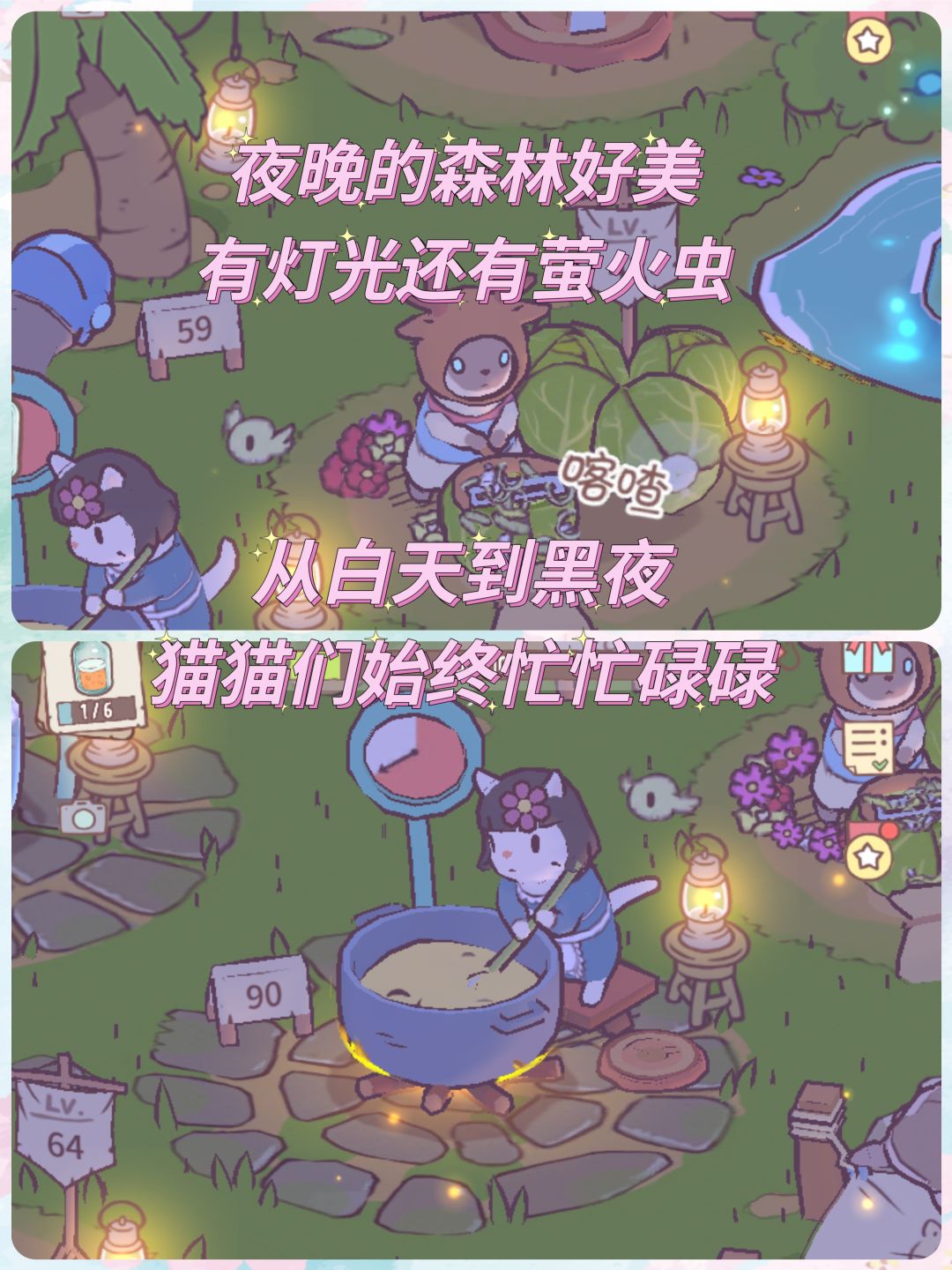 💘 好喜欢看它们一个个在自己的工位上忙个不停,切菜的、煮汤的、料理果汁的,还有累了的会自己跑去玩蹦床和听音乐解乏,只是盯着这些忙碌的猫猫心情就很美妙。游戏的细节也不错,印象最深的是汤汁煮开的翻滚声真的好逼真,而且在广告管理处还看到了熟人,闪电是你吗?!到了晚上森林里还有萤火虫和灯光,似有若无的蝉鸣,氛围好舒服啊,另外休憩设施的交互做的也很赞,小猫玩蹦床每次都硬控我5秒!