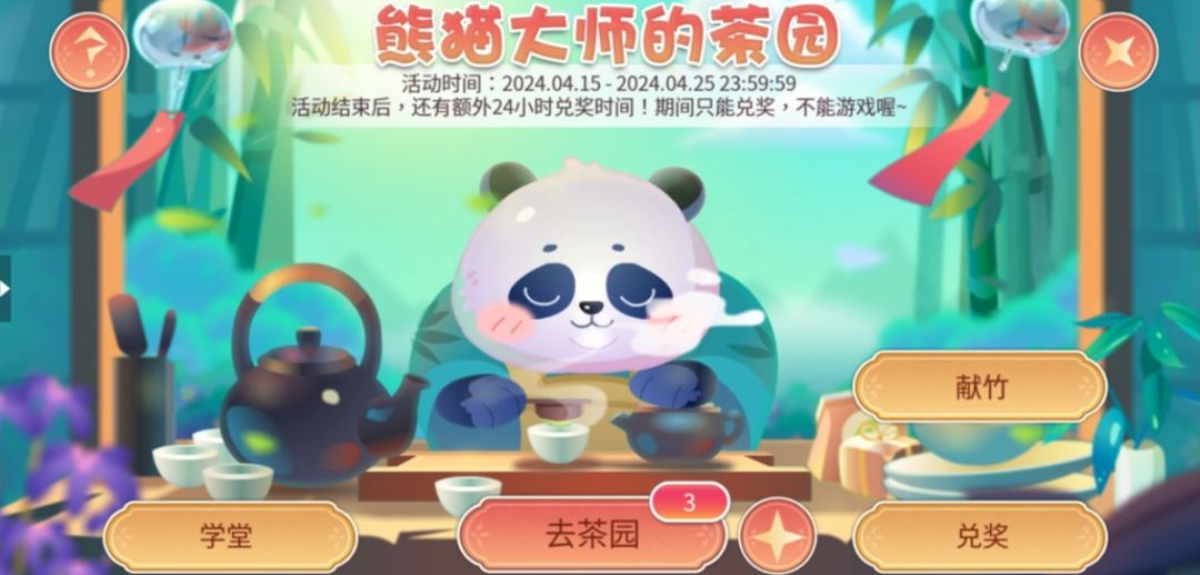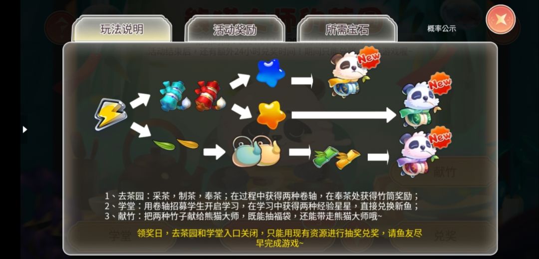 为熊猫大师献竹子,可以进行抽福袋,福袋中藏有大奖,抽到大奖后会刷新一组新的福袋。献出的竹子达到目标数量即可获得熊猫大师鱼。