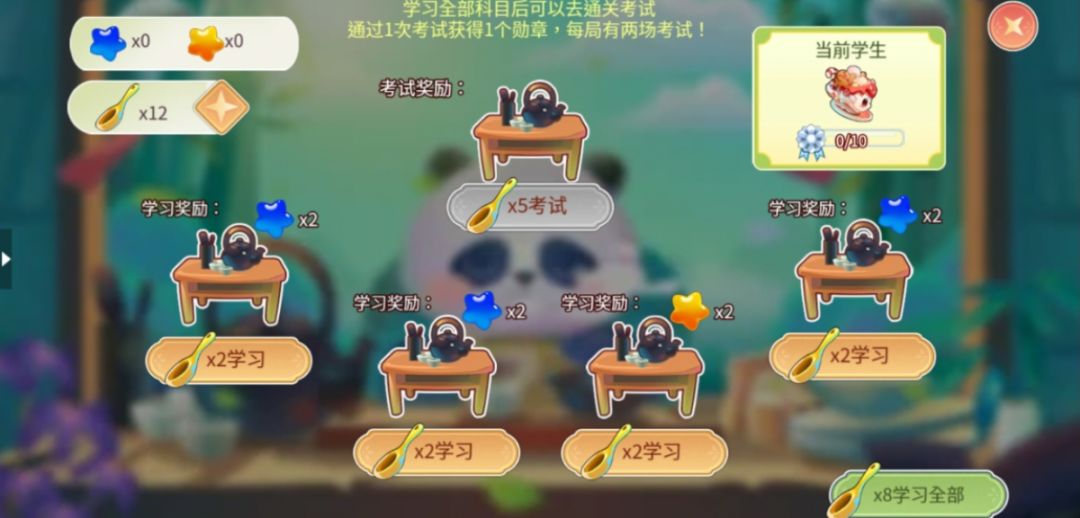学习全部科目后可以进行通关考试,通过1次考试可以获得1个勋章,每局可以进行2次考试。勋章达到一定数量即可获得对应的学生鱼儿。