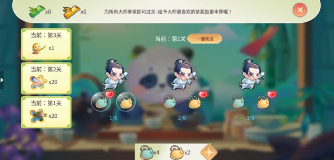 开采完第3片茶田后可以进行奉茶,为所有大师奉茶即可过关,给予大师更喜欢的茶能获得更丰厚的奖励。奉茶一共有3关,每关均有额外的奖励设置哦。