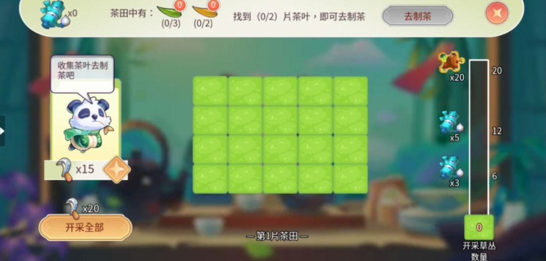 点击对应的茶田开采草丛,找到隐藏在草丛下的茶叶,达到目标数量即可去制茶。开采的草丛达到一定数量可以领取进度奖励。
