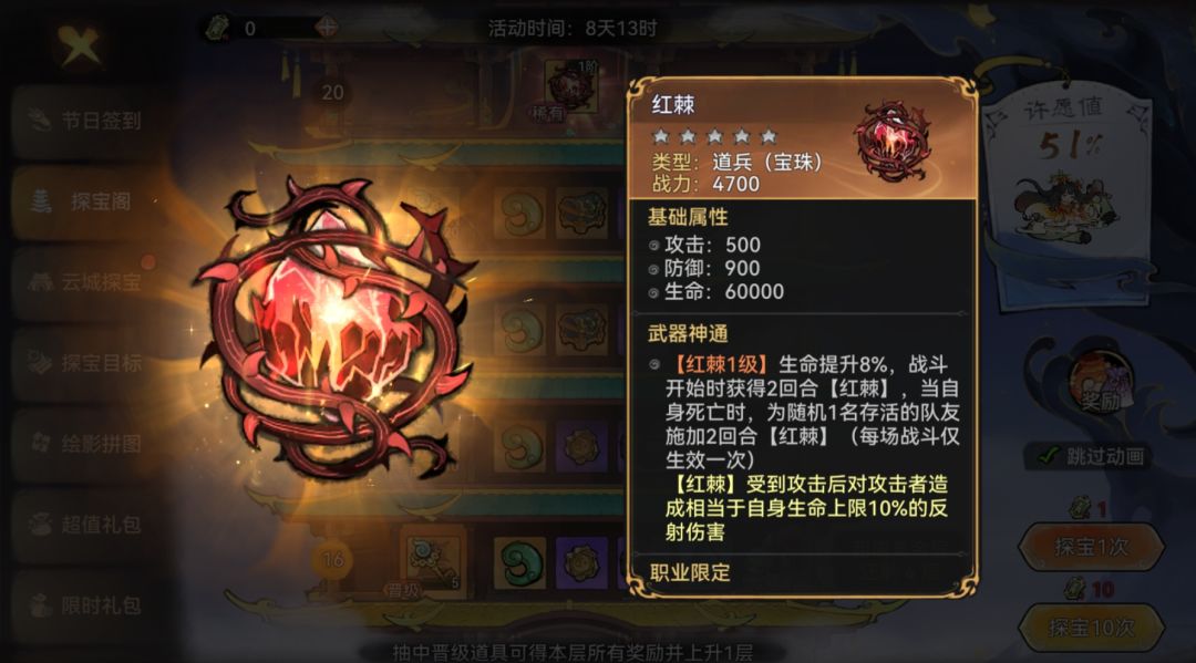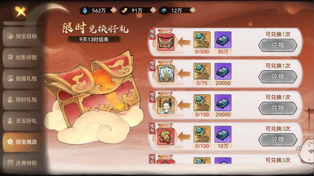 活动期间还会开启探宝商店,祖师可以将探宝阁和灵玉礼包中获得的登临仙钥配合一定的基础资源在其中兑换到红色古宝自选箱、庶务殿建筑皮肤:五月风清、我还能修仙等系列表情包、红色招募令、混沌天命灵魄等等奖励。