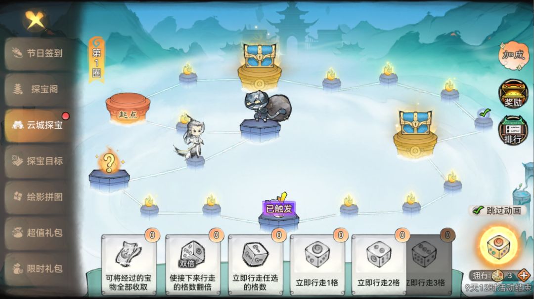 而云城探宝则是一个掷骰子的游戏玩法,期间会触发各种奖励箱子以及奇遇事件。