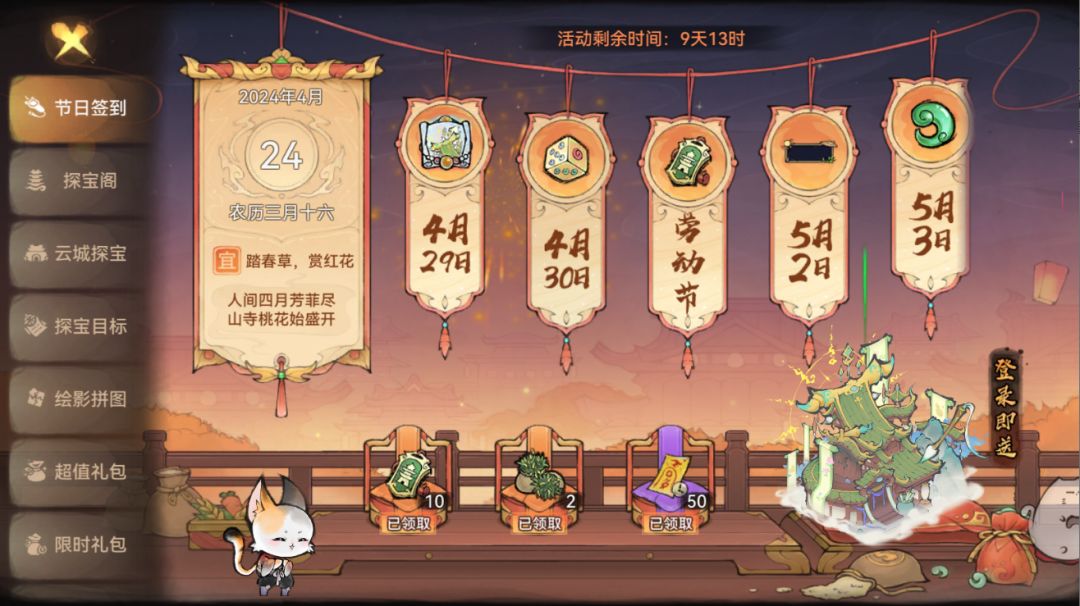 祖师还在担心五一劳动节开启了新活动会过于肝嘛?猫子们已经为我们着想好了,期间会开启庆宝特权。特权会帮助我们自动完成全部的日常以及仙书任务,还能获得弟子境界修行效率增加100%的效果!