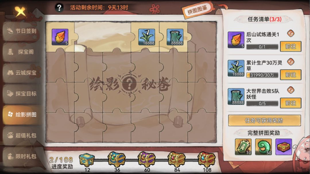 绘影拼图是通过完成日常任务获取拼图碎片,而且触发的日常任务都比较简单易达成。但整个绘卷是随着时间进行解锁的,所以祖师不用急于当天全部完成。当解锁的碎片数量到达一定数量时可以获取到大量骰子用于云城探宝。解锁完整拼图也可以获取道具探宝秘令用于探宝阁寻宝。