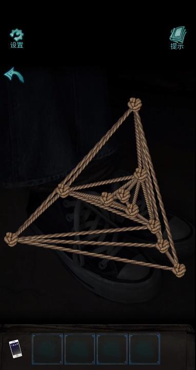 5、接下来你就要想办法脱身了,在此之前你需要解下绑在脚上的红绳,移动绳子的结点,让它变成麻绳就可以了。