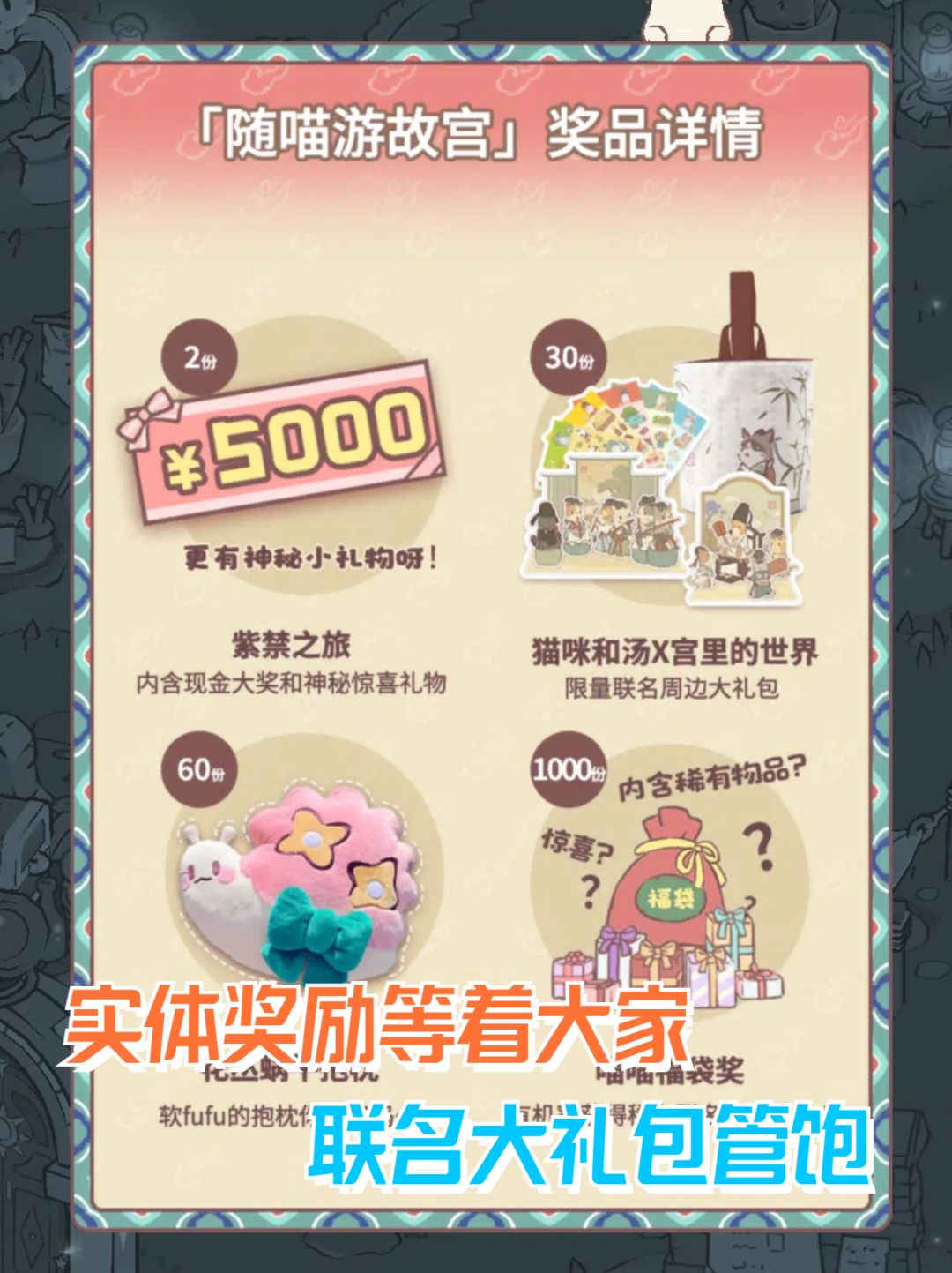 💡 特别值得一提的是,国服的首个专属活动也就是“云游故宫”同时开启。想象一下,在春天的御花园里,和你的猫咪一起漫步,欣赏花园里的美景,多么惬意啊!同时,还有好多礼品(虚拟+实体)等着大家领取,是不是很吸引人。那就赶快下载游戏,和我一起进入猫咪和汤的世界吧!!!