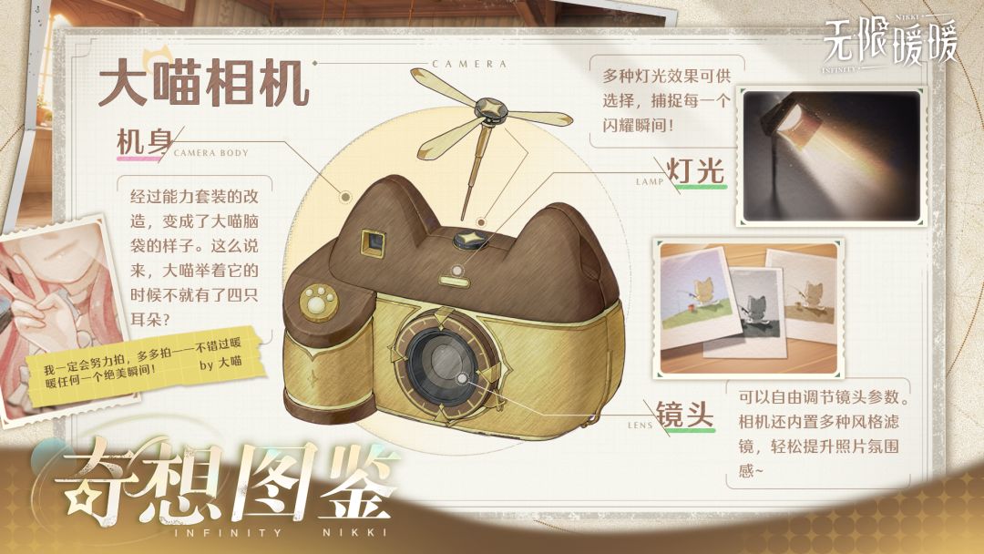 经过能力套装改造,外观变成了大喵脑袋模样的相机。拍照时,可以自由调整镜头参数、灯光效果、滤镜效果和拍照动作。