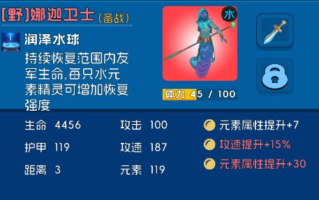 技能:持续恢复范围内友军生命,水球内每只水元素精灵可增加恢复强度
