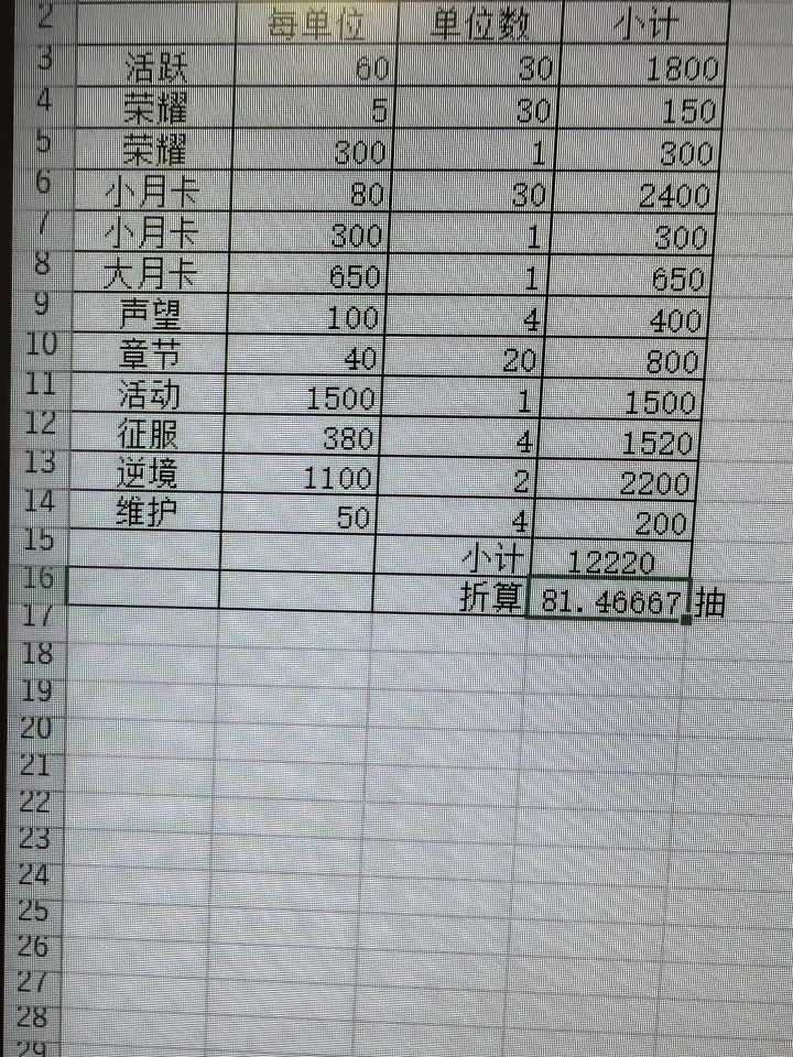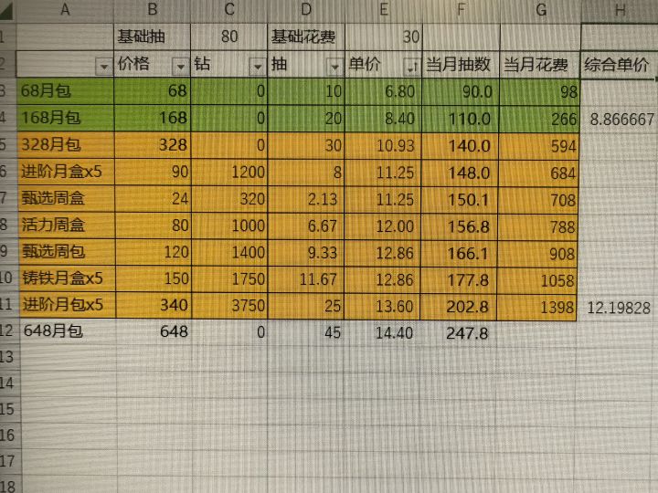 ③第二档:各种礼包,平均12块2一抽,基本填平第二档缺口。算上月卡和30抽的礼包平均一个月1400左右。