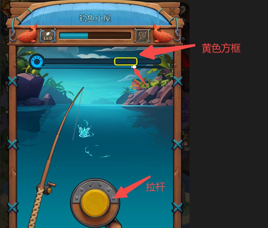 - 在钓鱼时,这个黄色方框是最佳拉力的位置,保持进度条在黄色方框内,方能将鱼快速拉向自己;