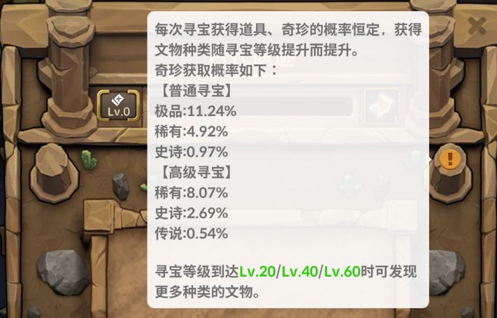 - 每次寻宝获得的道具,奇珍的概率是固定的,获得的文物随寻宝等级提升而提升;