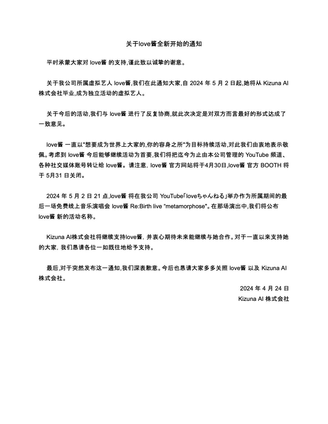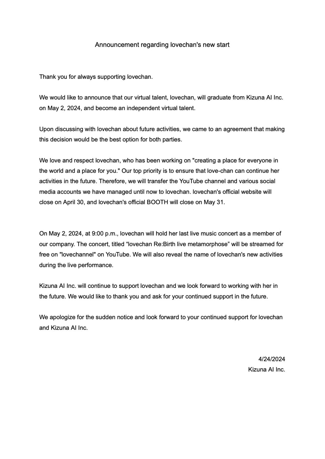 在官方发布的声明中,Kizuna AI 解释了love酱毕业的决定过程,并表示与love酱进行了反复协商,达成了对双方而言最好的决定。Kizuna AI 会将由公司运营和管理的YouTube 频道和各类社交媒体账户转移给 love酱;不过,love酱的官方网站将于4月30日关闭,love酱官方 BOOTH 也会在5月31日关闭。