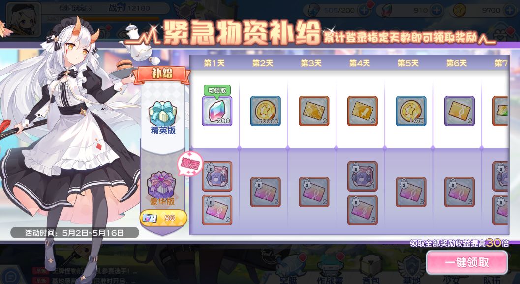 亲爱的指挥官,全新登录补给活动即将来临,活动期间连续登录即可领取相应奖励,激活豪华补给更可额外获取稀有道具奖励~