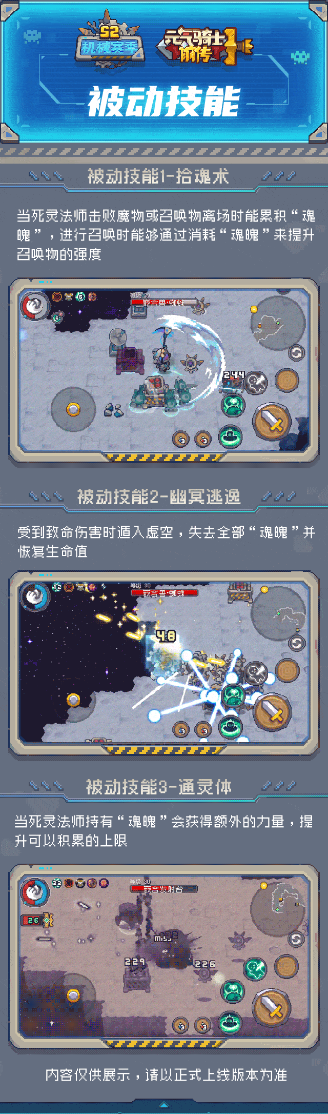 死灵法师其技能特点为“收集魂魄”和“消耗魂魄”。战斗前先释放通灵师的主动技能【聚灵术】&【灵界之门】攻击魔物,也可以利用【暗魂复生】将被击败的魔物变成召唤物协助战斗,快速累计“魂魄”,达到一定数量“魂魄”后释放更加强大的【亡灵骑士】,这时可以选择【灵魂占据】附身到“亡灵骑士”召唤物内控制其行动并持续恢复“魂魄”,但也要看好自身生命值避免消耗完后“死亡”哦!
