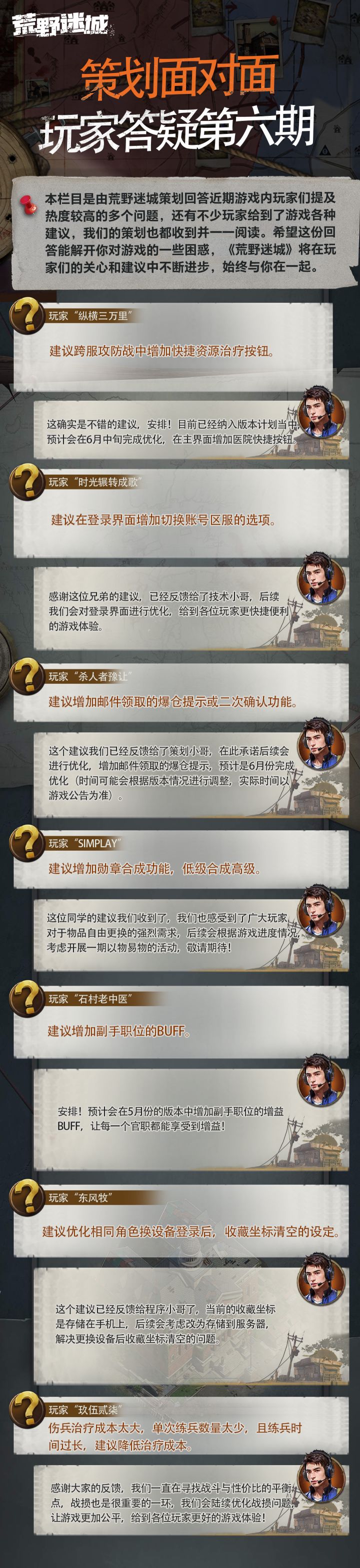 本栏目是由《荒野迷城》策划回答近期游戏内玩家们提及热度较高的多个问题,还有不少玩家给到了游戏各种建议,我们的策划也都收到并一一阅读。希望这份回答能解开你对游戏的一些困惑,《荒野迷城》将在玩家们的关心和建议中不断进步,始终与你在一起。