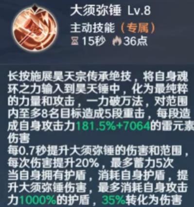 大须弥锤打出来的伤害是根据盾量计算的,昊天九绝是直接给盾的,这两个技能明显有不错的 连携效果,不过大须弥锤这个技能蓄力的时间太长了,太长的话就有两个问题。