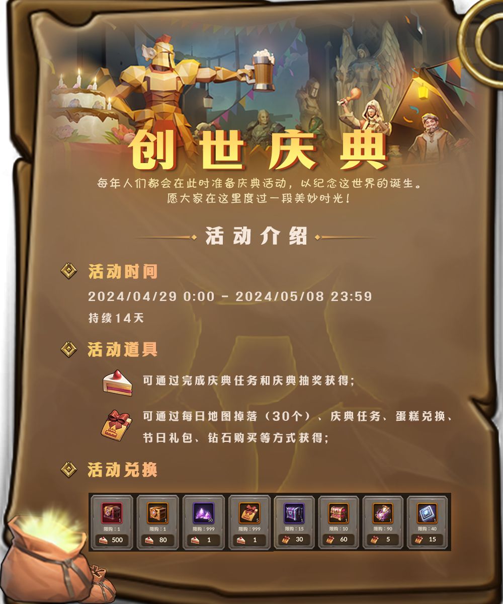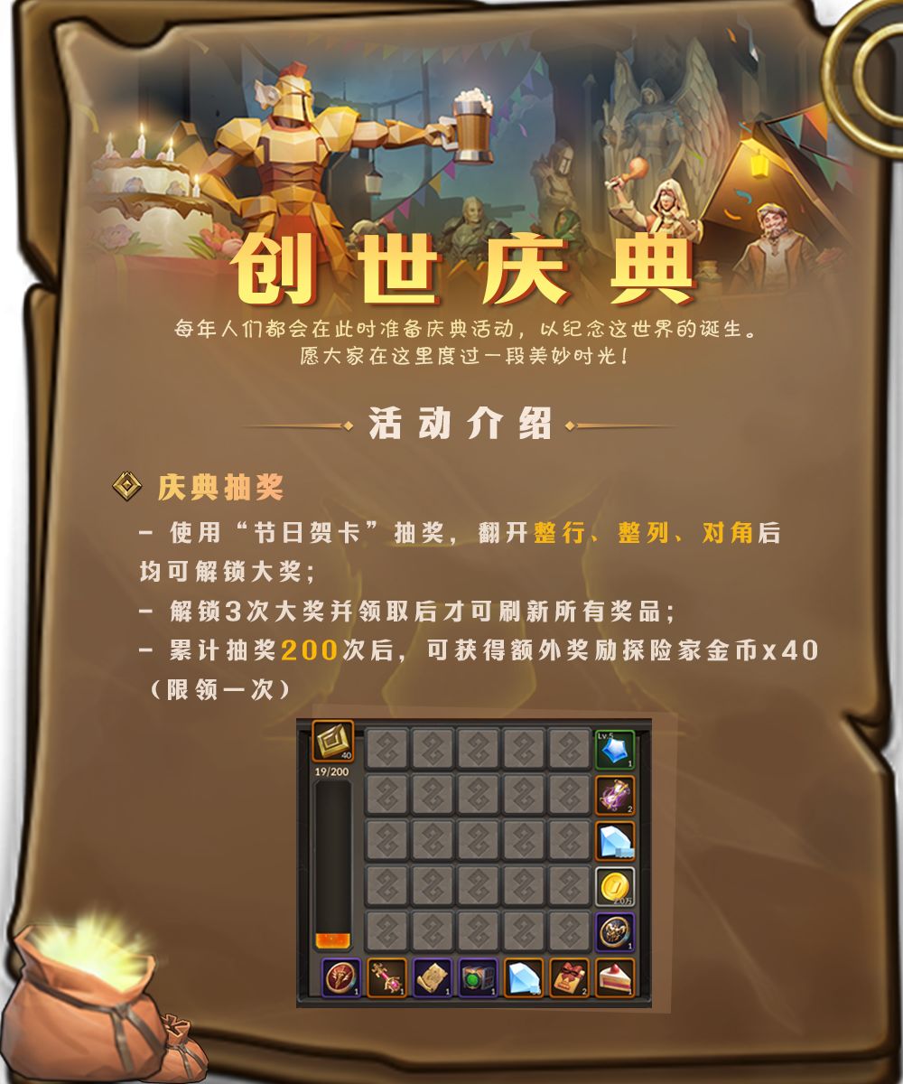 营地已备好美食,探险家协会也整顿完毕准备开张,欢迎来参加一年一度的创世庆典活动!