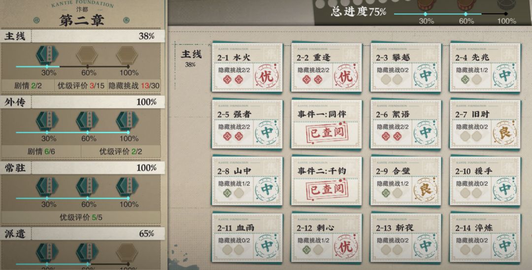 进度里面会看到当前章节主线、外传、常驻(资源本)、派遣的进度,当达到进度的30%、60%、100%后能拿到奖励,比如器者考核材料、经验书、抽卡券、灰珀、装备等等。