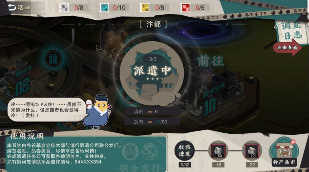 派遣主要送的是扯淡图章,可以在特产易市里面换其他资源。当章节的派遣的收集进度达到50%和100%时,还能拿150个灰珀。
