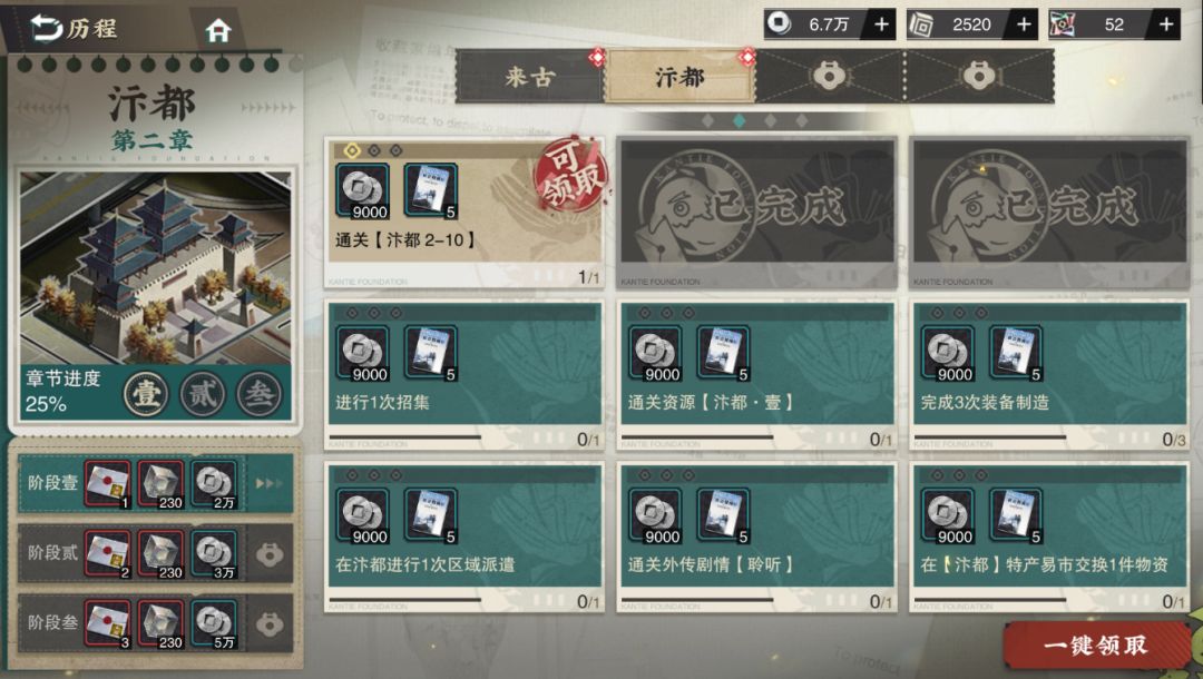 历程里面分进度和指定的关卡,其中进度里面会送抽卡券、灰珀和东谷币,通关指定主线关卡会送器者经验书、装备经验、东谷币等。