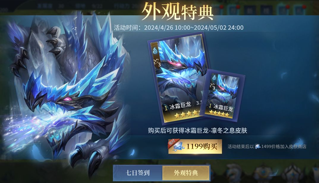 新增了冰霜巨龙全新外观--凛冬之息,活动期间购买享有特惠