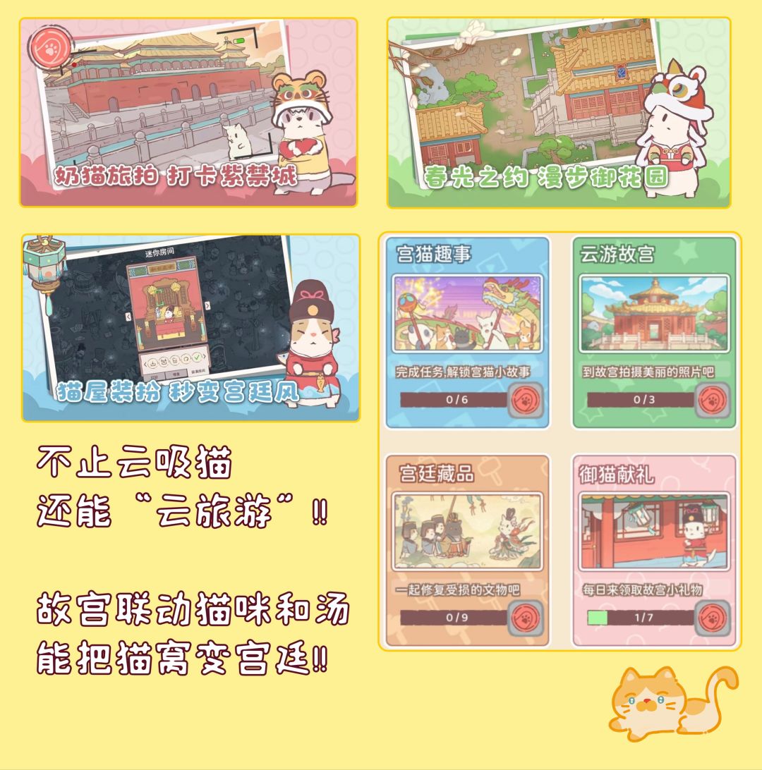 猫咪和汤刚公测就联动了故宫这个大IP,简直太有实力了!!猫咪们化身宫廷的宫女,穿上美美的衣服~森林也变成故宫的样子,乍一看非常可爱!!还有更多联动福利等你体验!!