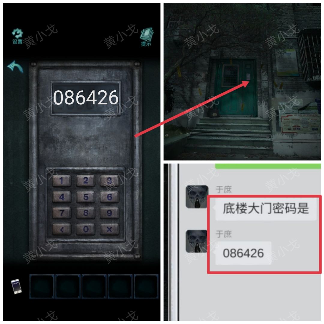 3.给手机充上【充电宝】,获得线索(底楼大门密码:086426)