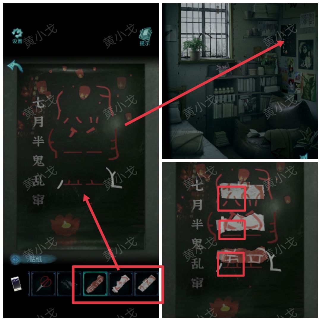 27.点击墙上的海报,放上三张【贴纸】,再把贴纸放到正确的位置上,拼成完整的字,获得线索(八二五)