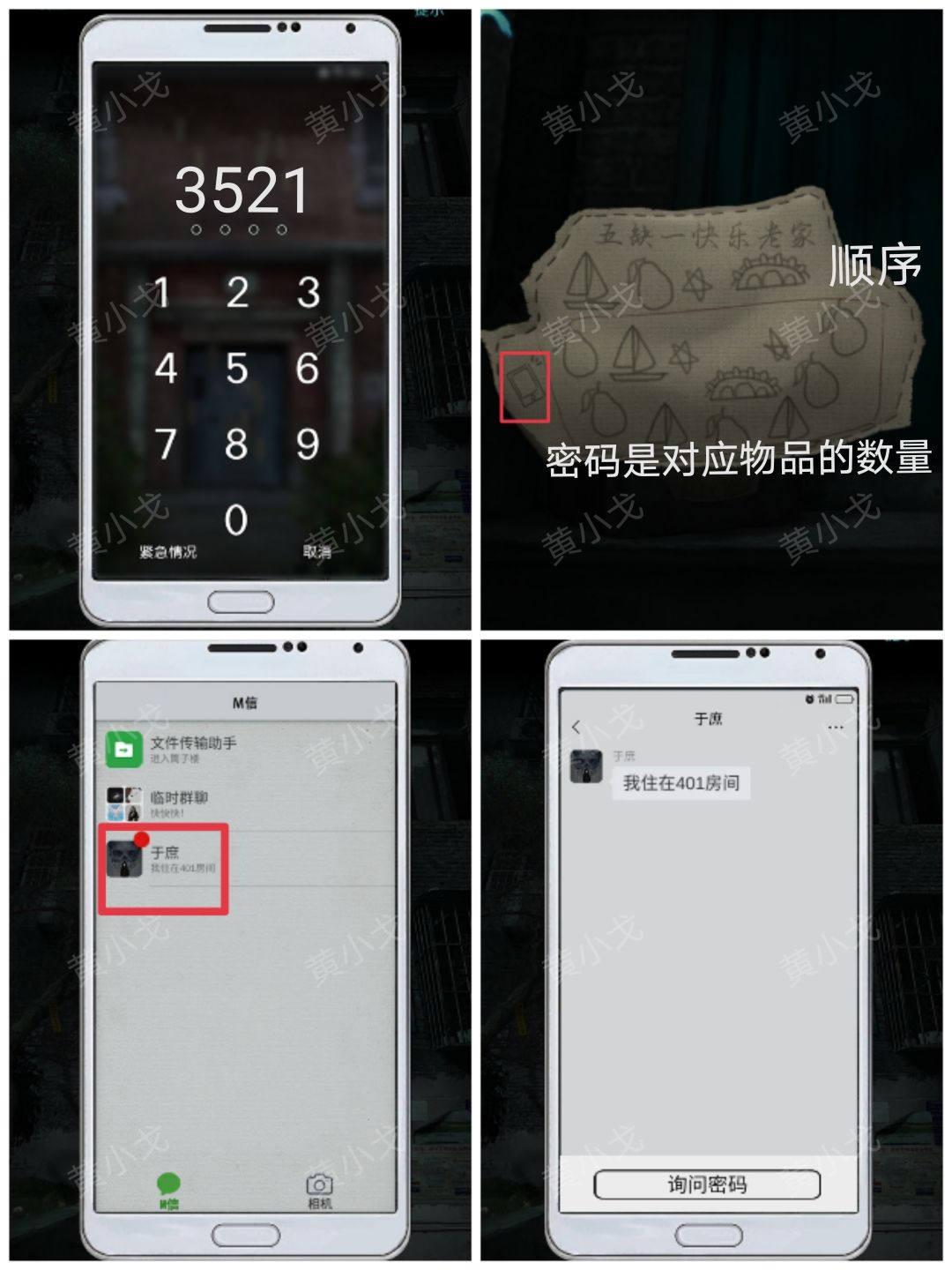 2.拿出【手机】,根据贴纸上的线索,输入密码:3521(红框外面的物品表示顺序,密码是红框里面的对应的物品的数量);打开手机,查看于庶发来的信息