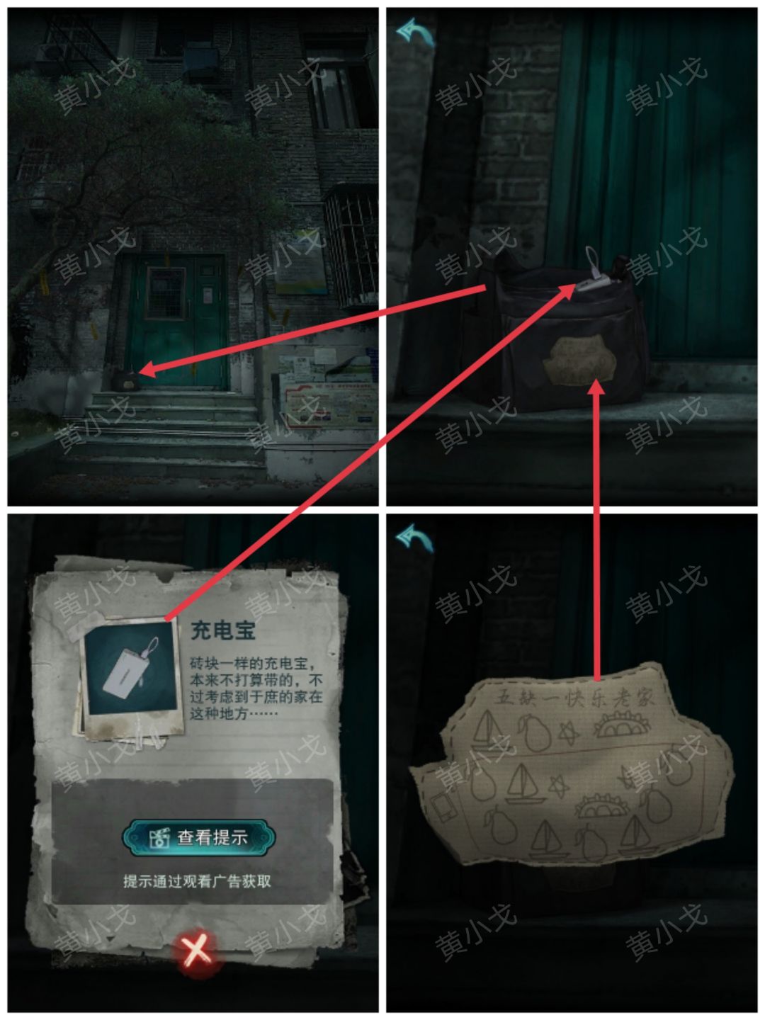 1.(筒子楼外)点击门外的背包,获得【充电宝】,查看背包上的贴纸