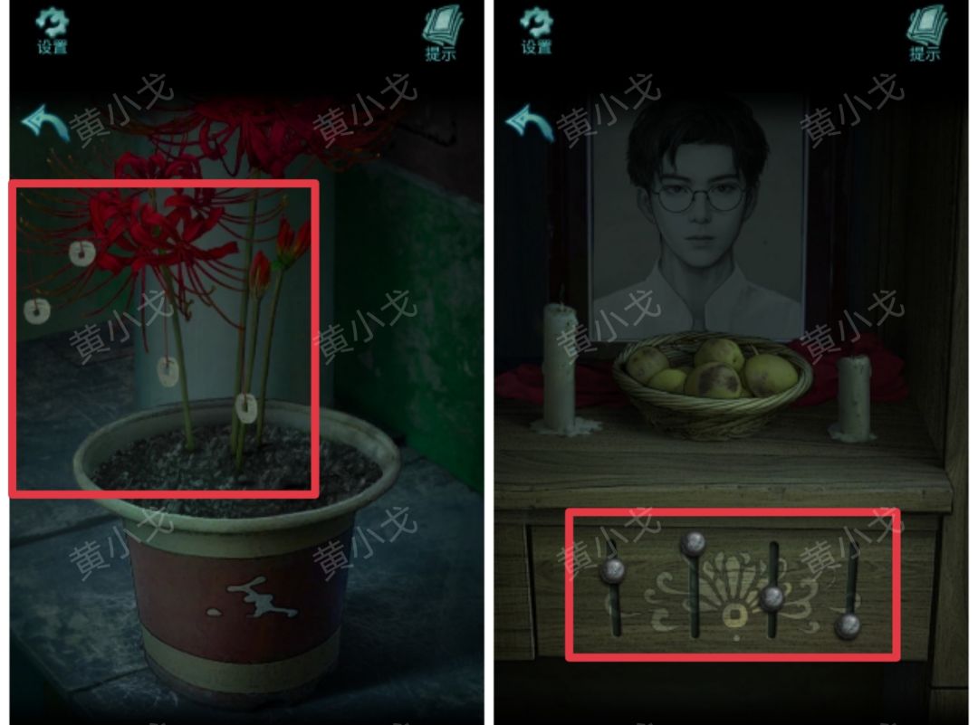 9.点击柜子上的彼岸花,挪开花盆,查看花盆下面的名片(注意彼岸花上铜钱的位置)