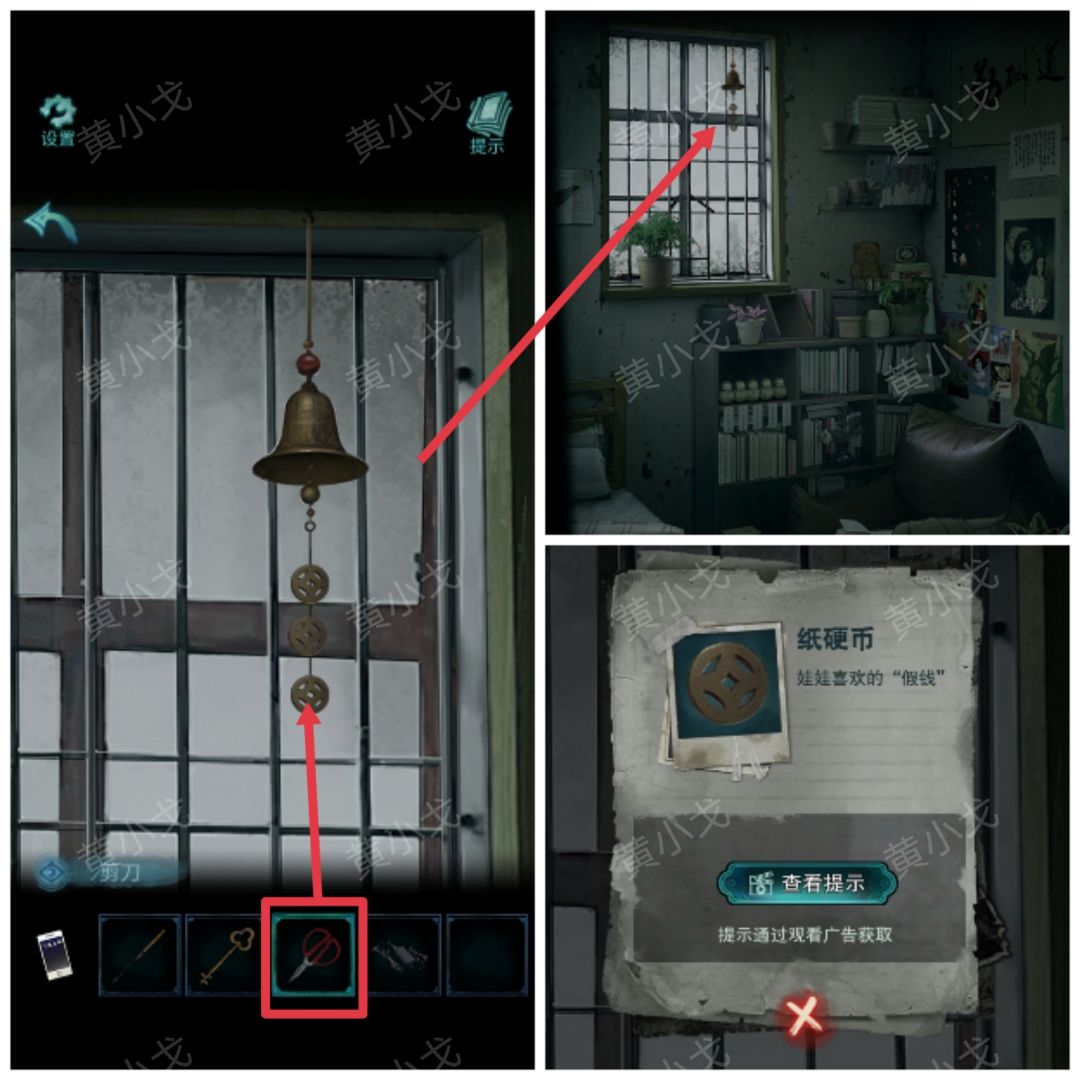 28.点击窗台上的风铃,用【剪刀】剪一个【纸硬币】