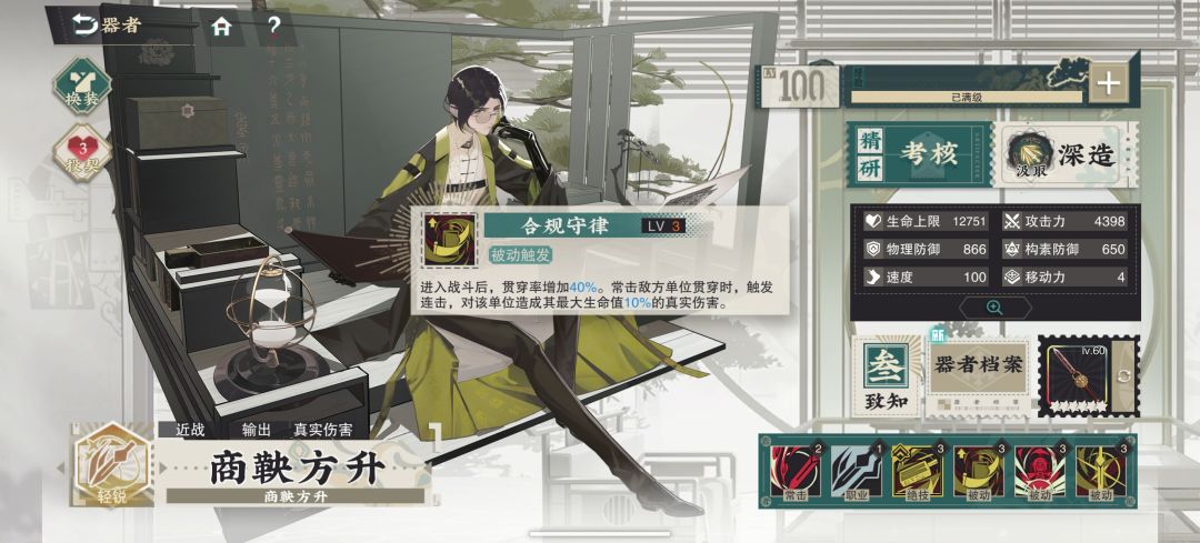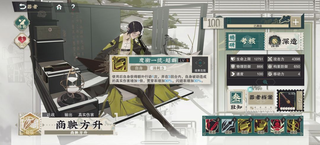 3级绝技,释放后额外行动,2回合内被动真伤翻倍,贯穿提升30%,闪避提升30%(图中三回合为致知三的技能升级效果,三命多一回合)