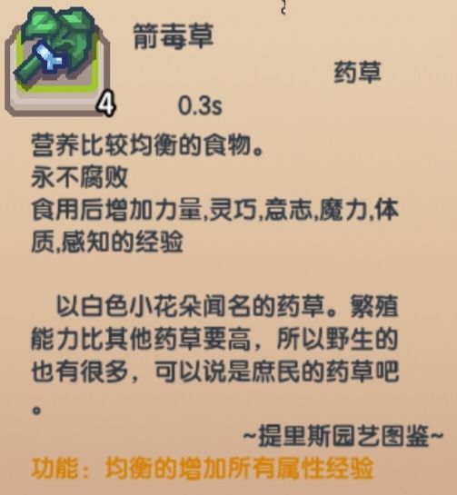箭毒草曾经是温戴尔森林独有的植物,没有人知道它是什么时候出现的,只知道它遍布温戴尔森林,而且出现的时间要晚于省力药草、止血草跟饱腹草。