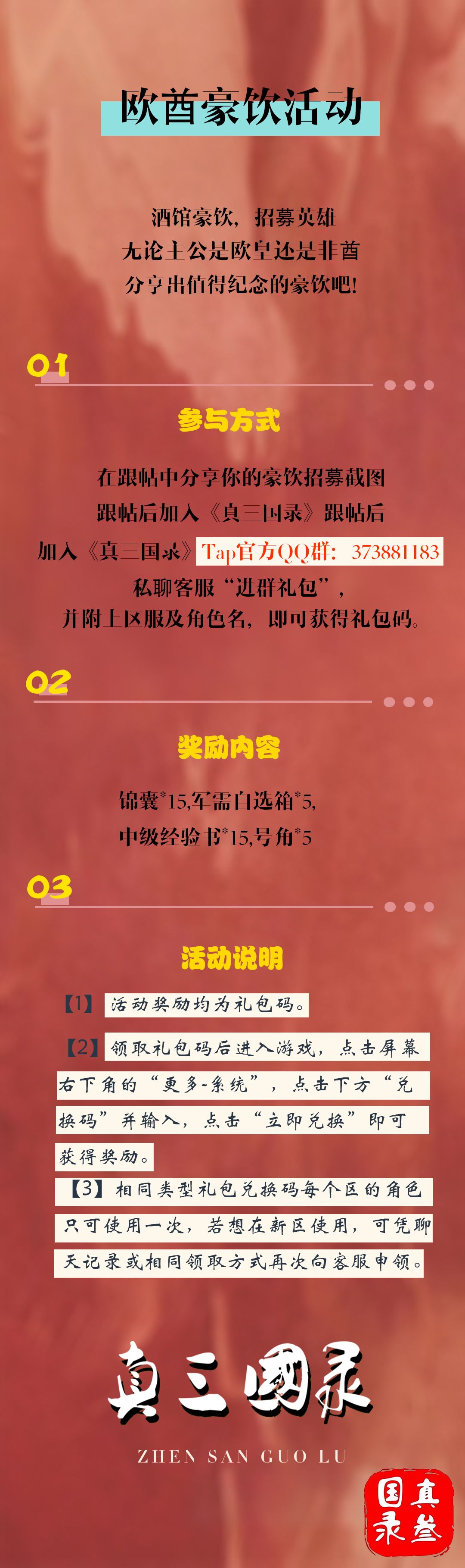 领取奖励:跟帖后加入《真三国录》Tap官方QQ群:373881183,私聊客服“欧酋豪饮”,并附上跟帖截图,客服审核后即可获得礼包码。