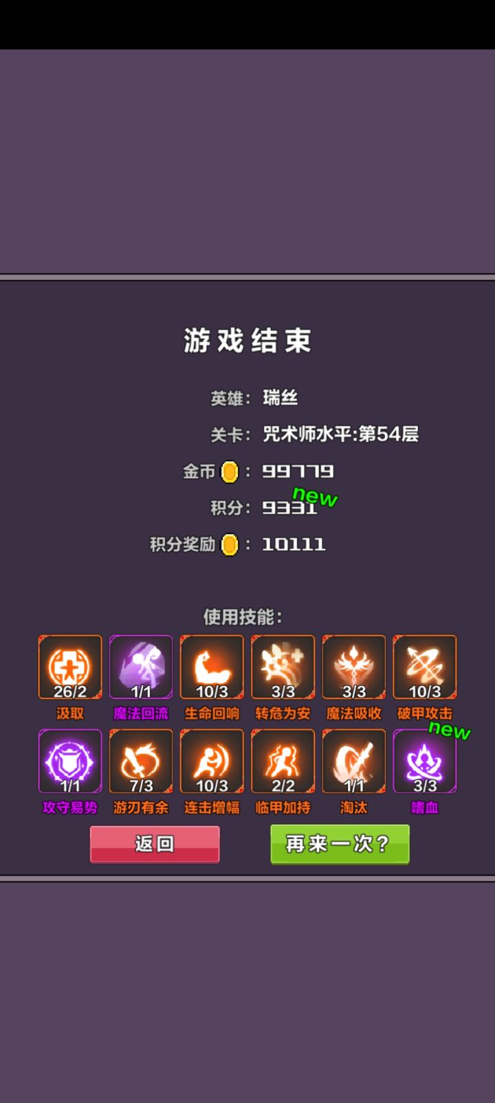 2.局内技能选择:在技能格子没那么多之前优先:汲取(击杀怪物增加血量或蓝量上限) 魔法回流(魔力回复超出会回复血量) 生命回响(攻击前回复百分百血) 转危为安(受伤后回复百分百蓝) 魔法吸收(攻击前回复蓝量) 破甲攻击(减少怪物护甲) 攻守易势(怪物攻击护甲互变) 游刃有余(耗2点蓝加攻击次数) 连击增幅(每次攻击增伤)临甲加持(护甲翻倍) 淘汰(30%血斩杀) 嗜血(50%生命以上时扣10%生命翻倍攻击)