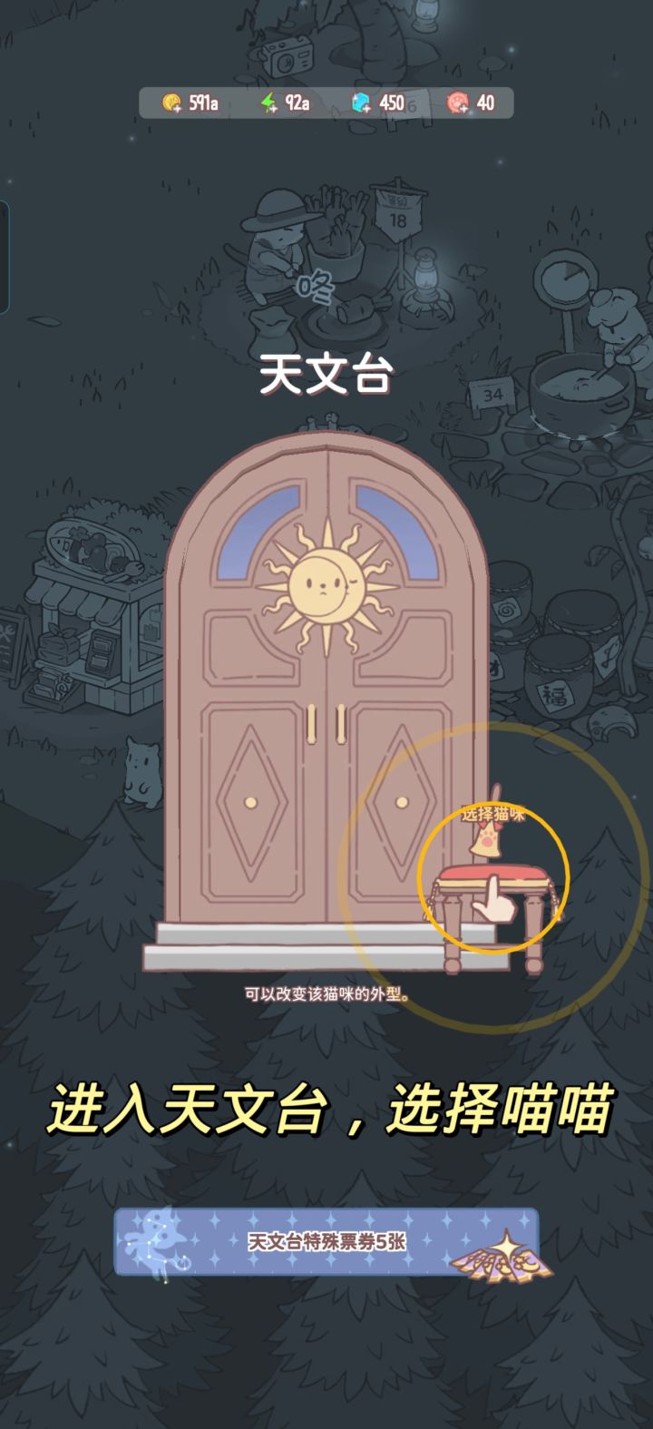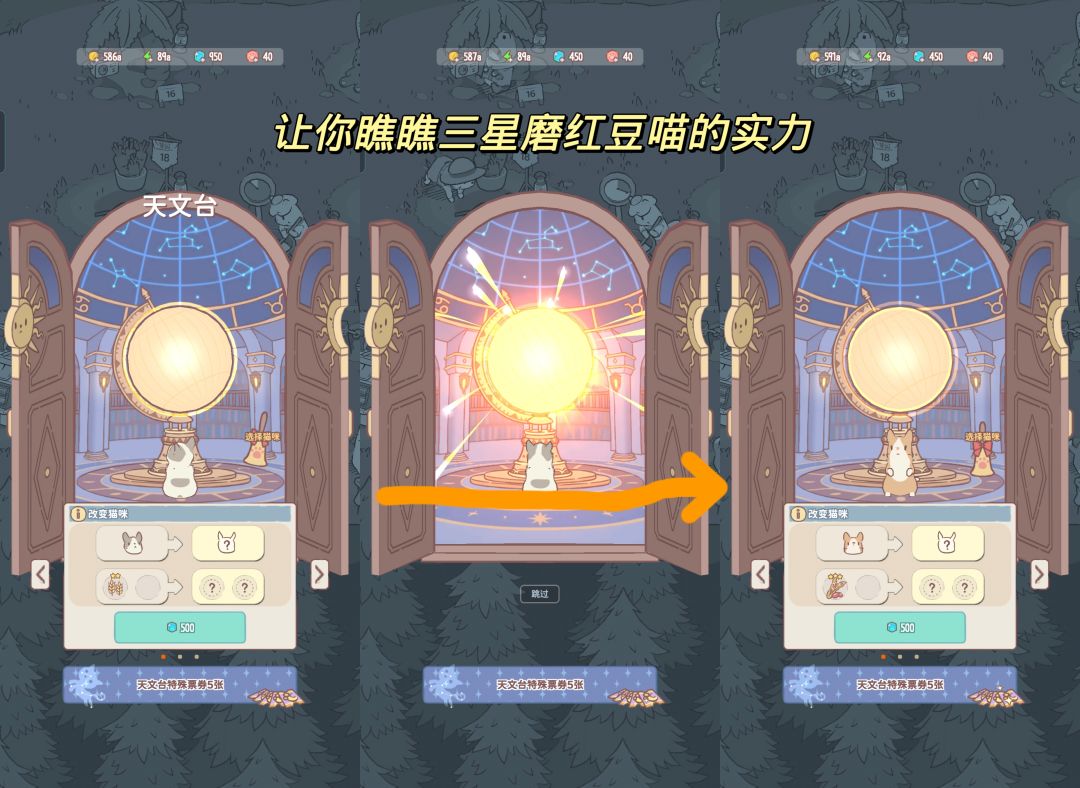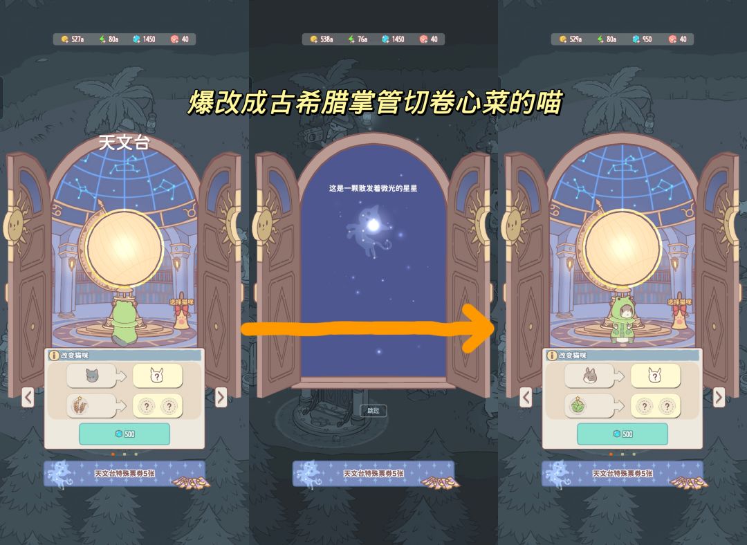 进入天文台后,选择想要被更替的喵喵,接着点击花费500钻石,你就可以得到一个新喵喵啦~
