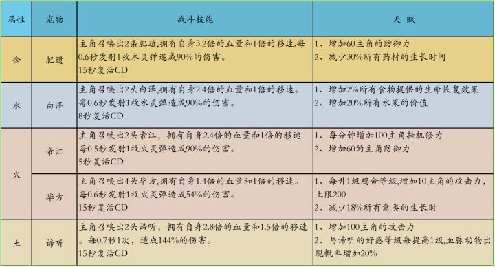 宠物能辅助主角进行攻击,能较大幅度提高输出能力,宠物有其对应的五行属性,而战斗技能大方面也是其属性的攻击,比如毕方是火属性,它的战斗技能也是火属性。