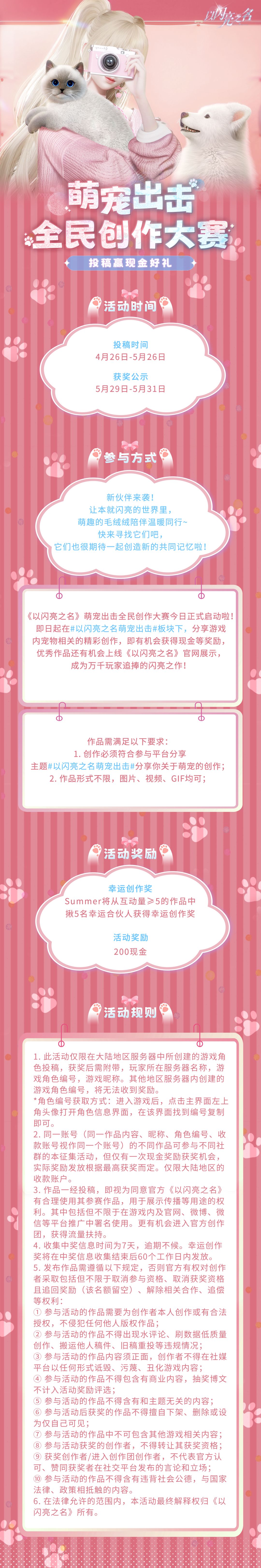 《以闪亮之名》萌宠出击全民创作大赛今日正式启动啦!即日起在#以闪亮之名萌宠出击# 板块下分享宠物相关的游戏创作,即有机会获得现金等奖励,优秀作品还有机会上线《以闪亮之名》官网展示,成为万千玩家追捧的闪亮之作!