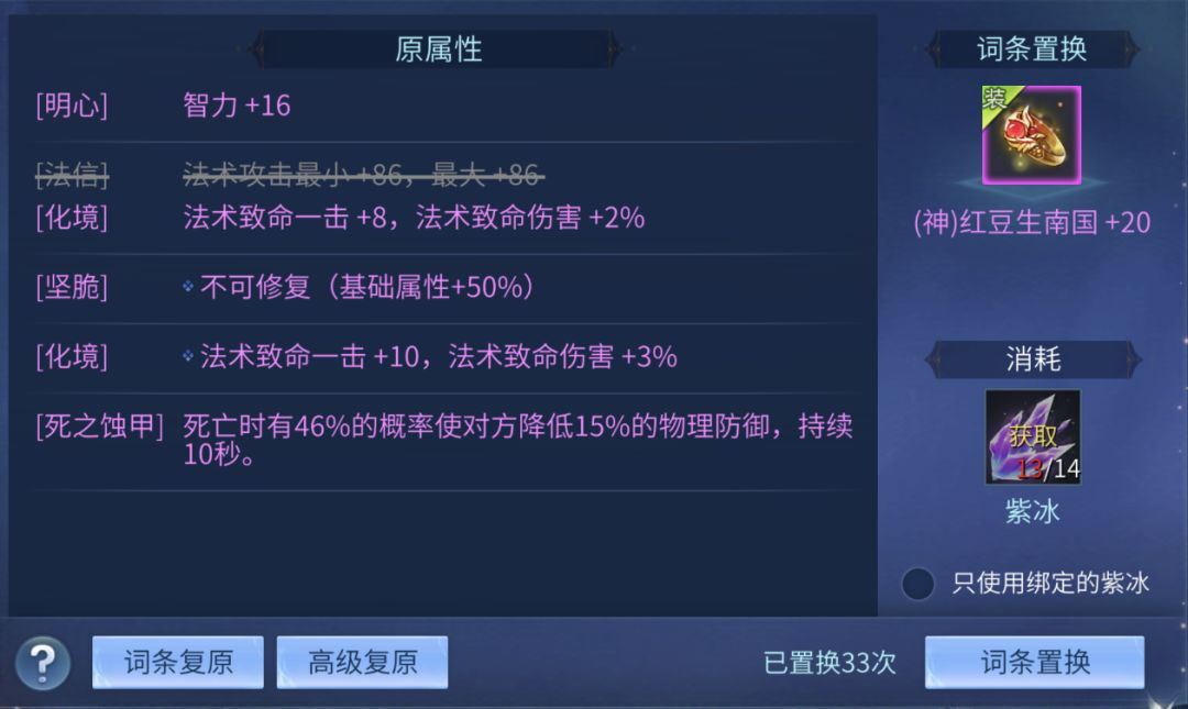 将自己的神兵戒指进行一个置换会获得什么样的结果?自然是如履薄冰的体验!在已经有智力+致命+不修的情况下仍然冒险,最终获得了一个不错的固定面板。