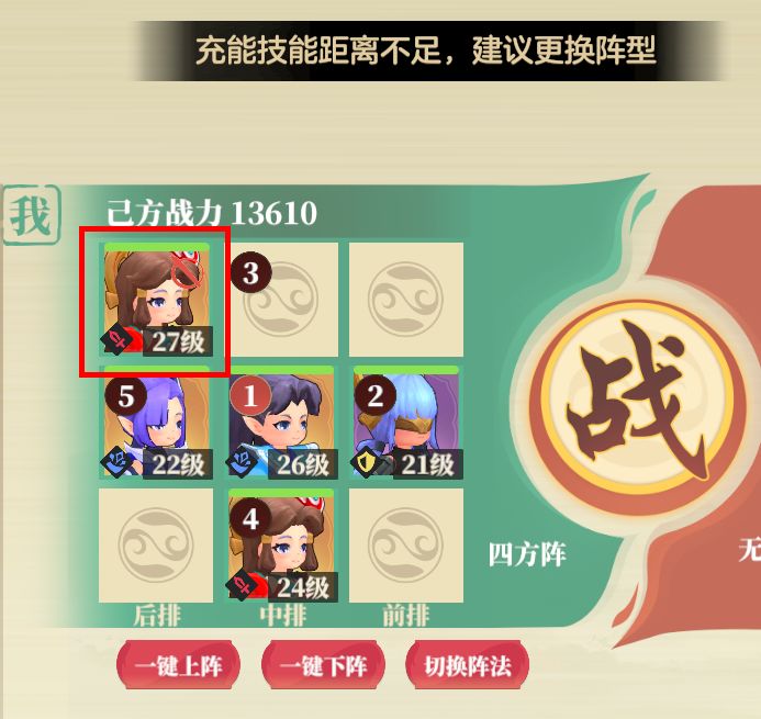但请留意,不同的职业的充能技距离不一样。这里如果我把充能技距离短的白英放在了后方,那么她本场战斗就无法释放充能技了!