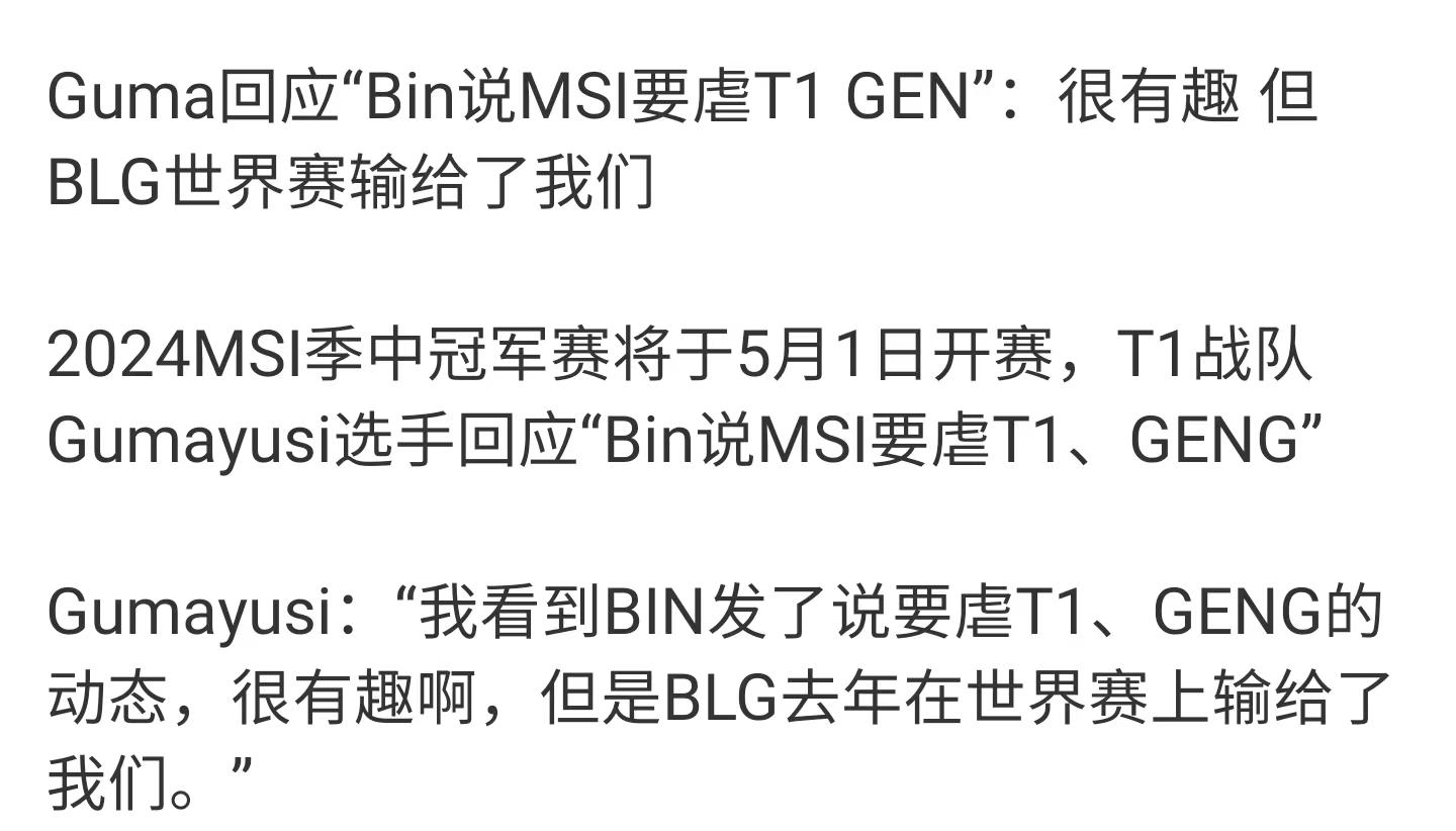 而Bin选手的表态也引起了T1的ad选手gumayusi的不满,guma更是霸气表示,虽然在去年的MSI上T1不敌BLG,但在S赛上是二比零击败了BLG,去年S赛血虐了BLG,今年会继续血虐BLG。